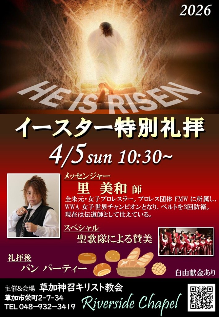 ※カーナビで検索する際、希に草加市吉町の「草加チャペル」に誘導されることがあります。正しい住所は草加市栄町ですので、ご注意願います。